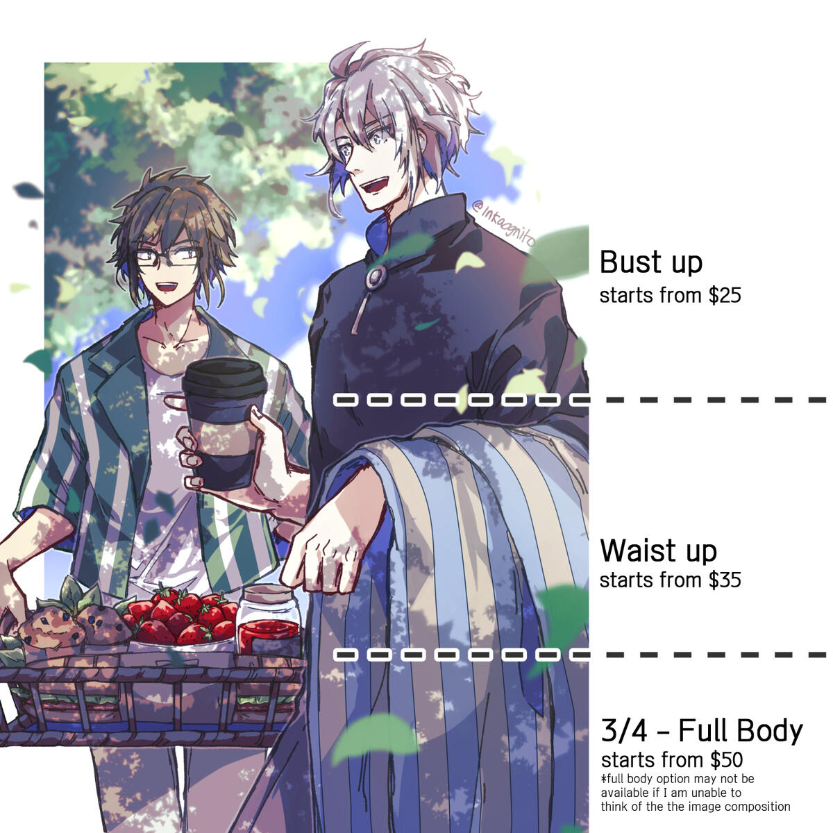 Hi! My name is kao (@tsukkaomi / @inkaognito on twitter). My commission is currently OPEN, feel free to check the price list and ToS if you are interested in commissioning. 👍✨